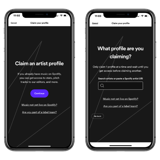 Una vez que su música esté disponible, visite Spotify para artistas, inicie sesión con su cuenta de Spotify y reclame su perfil de artista buscando su nombre y proporcionando la información de verificación necesaria.