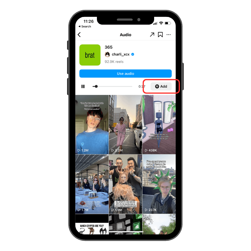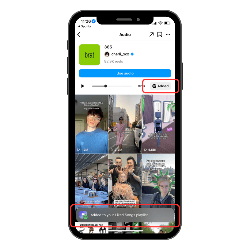 - Adiciones instantáneas a listas de reproducción: Cuando los fans descubren música en Instagram y la añaden directamente a sus listas de reproducción de Spotify , los artistas tienen más oportunidades de ganar difusión, tracción y visibilidad en Spotify. Esta transición del descubrimiento en las redes sociales a la escucha ayuda a aumentar la exposición y el impulso.
