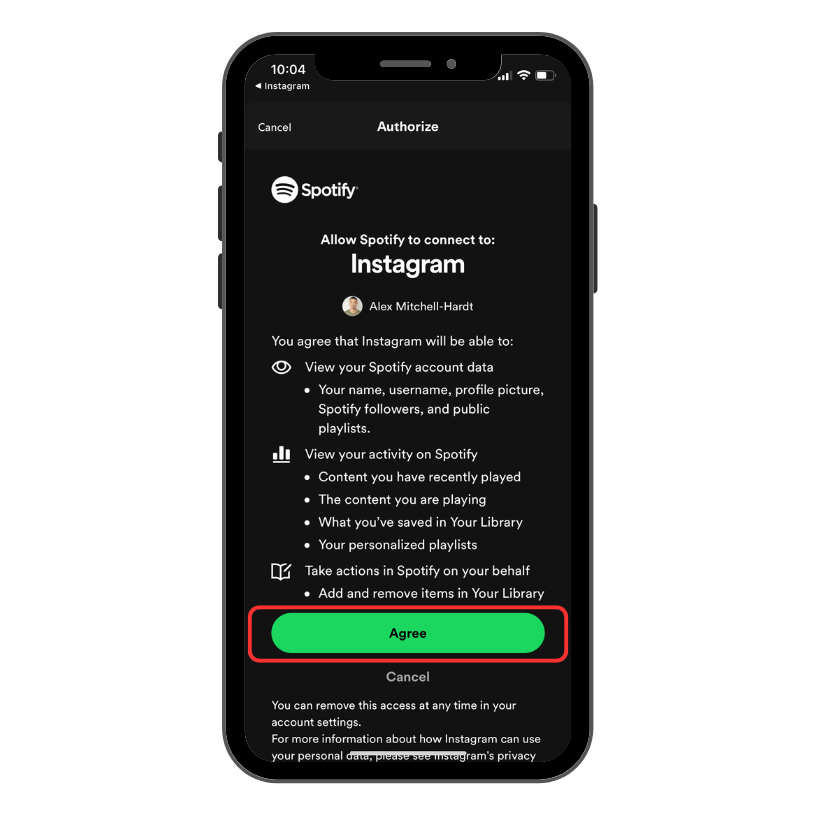 La primera vez que utilices la función Añadir canción de Instagram a Spotify , se te pedirá que conectes tu cuenta de Spotify a tu cuenta de Instagram. Solo tienes que seguir los pasos que aparecen.