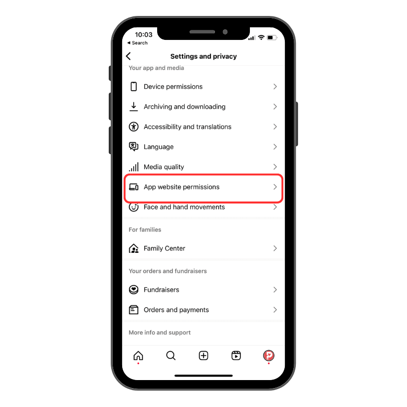2) Busque y pulse "Permisos del sitio web de la aplicación".