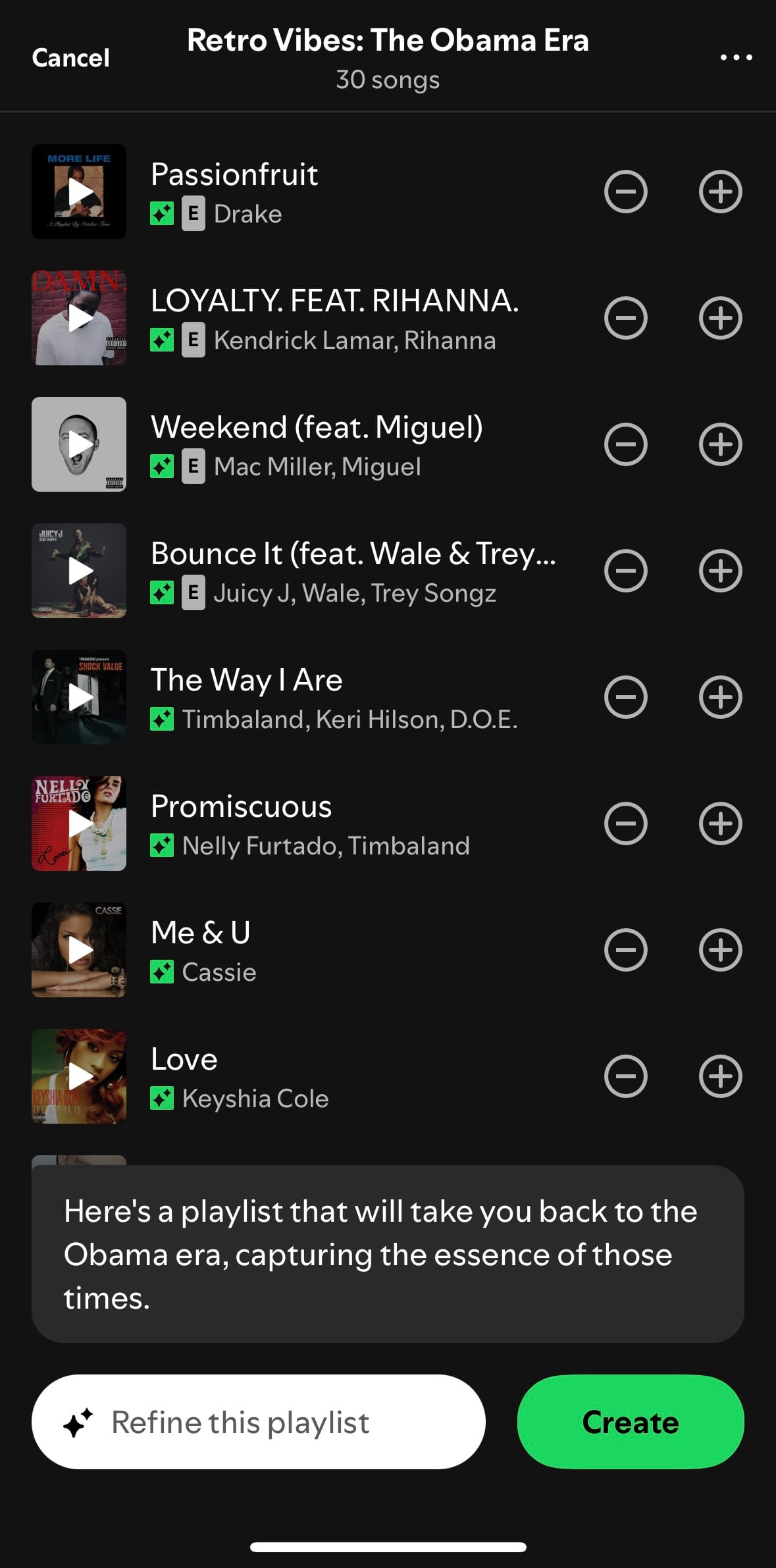 - Generar y personalizar: Deja que la IA cree una lista de reproducción y luego modifícala añadiendo o quitando canciones.