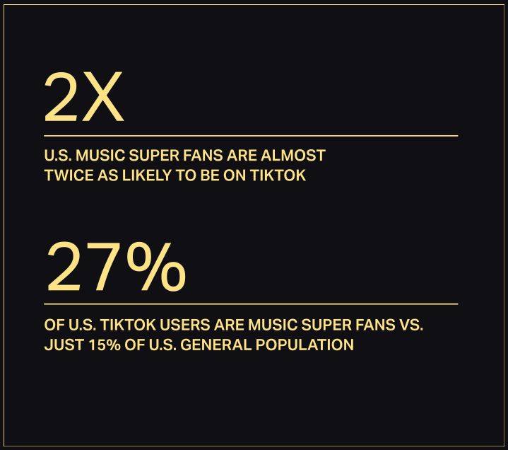 - Los usuarios estadounidenses TikTok tienen casi el doble de probabilidades de ser superfans de la música (27% frente al 15% de la población general)