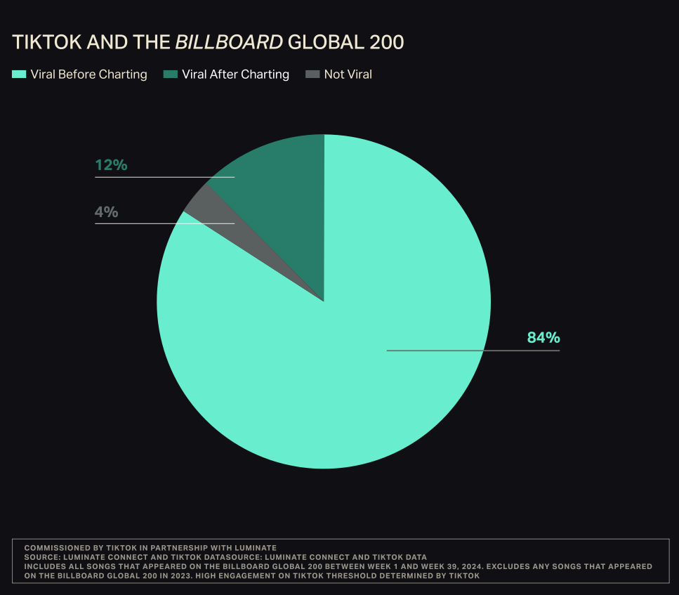 - El 84% de las canciones que entraron en el Billboard Global 200 en 2024 se hicieron virales primero en TikTok