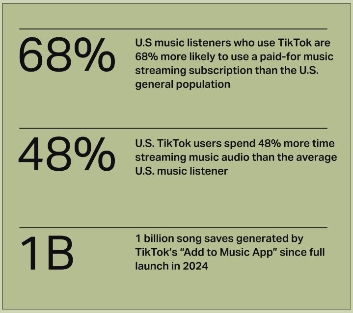- La función "Añadir a la aplicación de música", que permite a los fans guardar canciones TikTok directamente en Spotify o Apple Music, ha generado más de mil millones de canciones guardadas desde su lanzamiento en 2024.